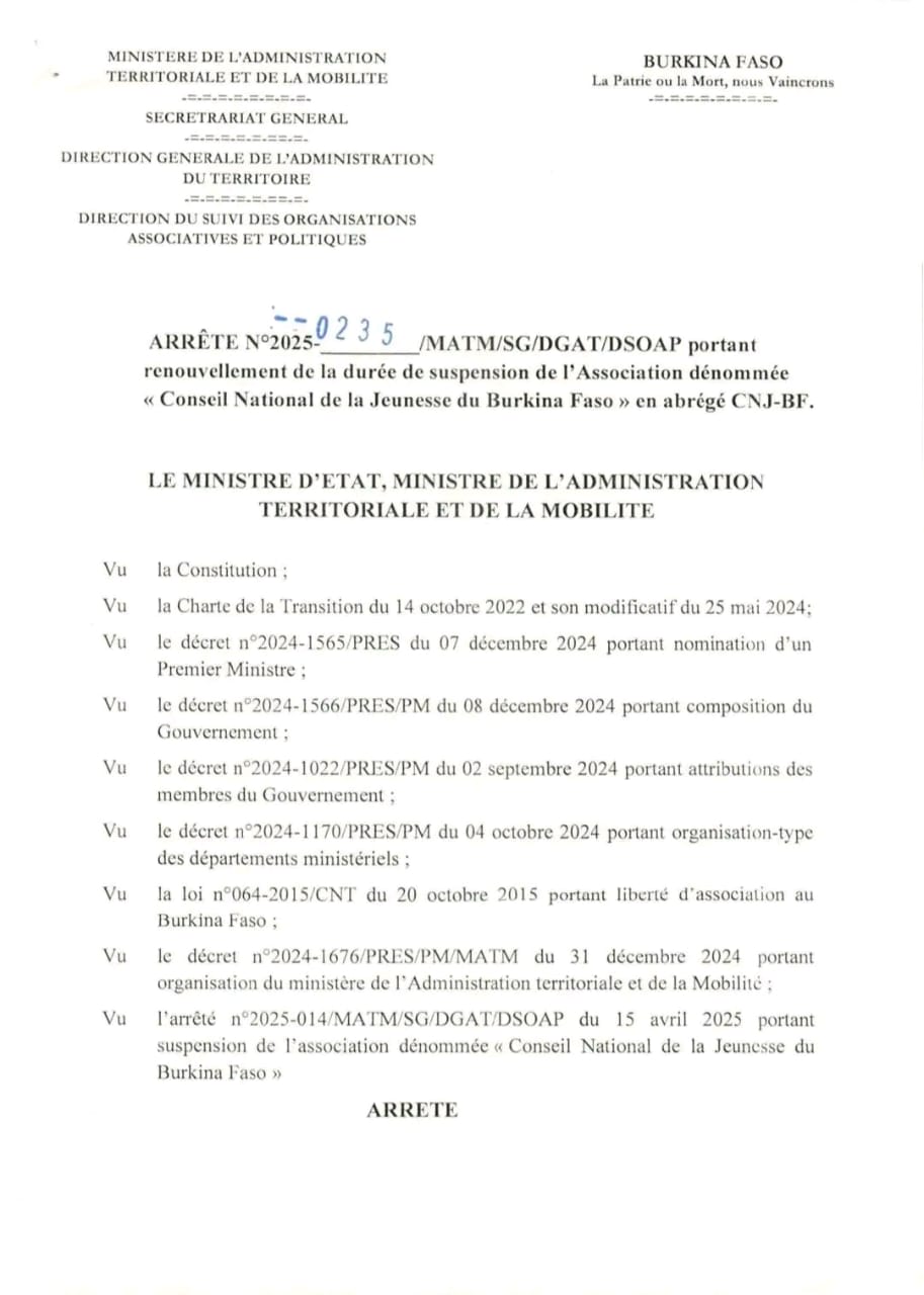 Par un communiqué en date du 21 juillet 2025, le Ministre de l'Administration Territoriale et de la Mobilité a décidé du prolongement de la suspension de 3 mois de l'association dénommée Conseil National de la Jeunesse du Burkina Faso enregistrée sous le récépissé N3926 du 09 novembre 2018. Cette décision fait suite à un précédent arrêté de suspension en date du 15 avril 2025.